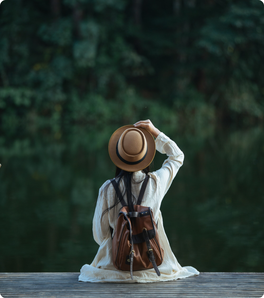 Rearview of a young beautiful woman wit white dress and hat enjoy nature and summer sitting on a wooden pier during sunrise and looking at the view with orange boats and mountain reflection at a beautiful turquoise water lake Lago di Braies, Trentino Alto Adige, South Tirol, European Alps, Italia, Europe